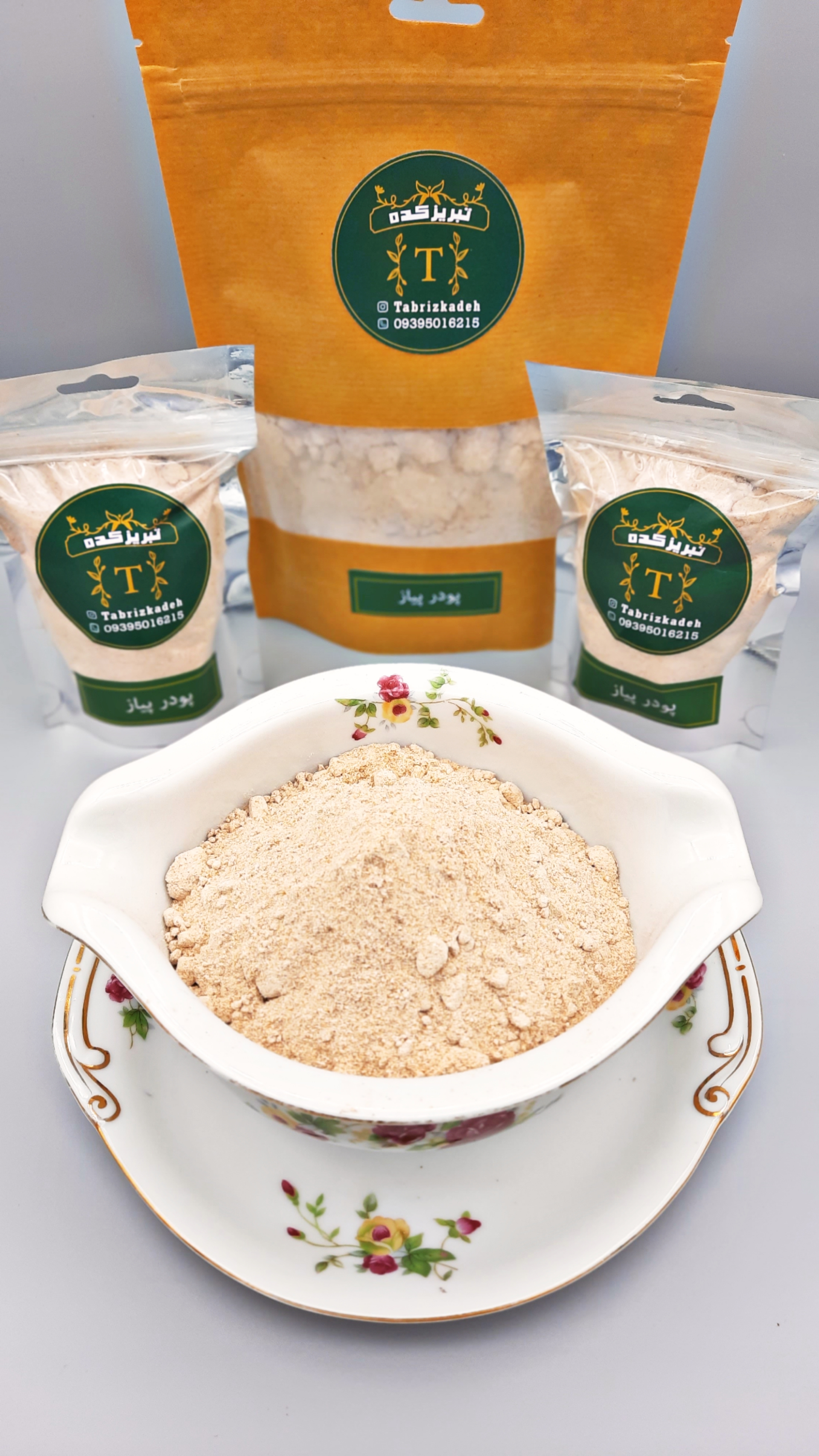 پودر پیاز خالص و طبیعی شهر تبریز برای مزه دار کردن انواع کباب ها، سوخاری ها و سرخ کردنی ها، لعاب دار کردن خورشت ها،و تهیه انواع سس های سالاد به کار میره