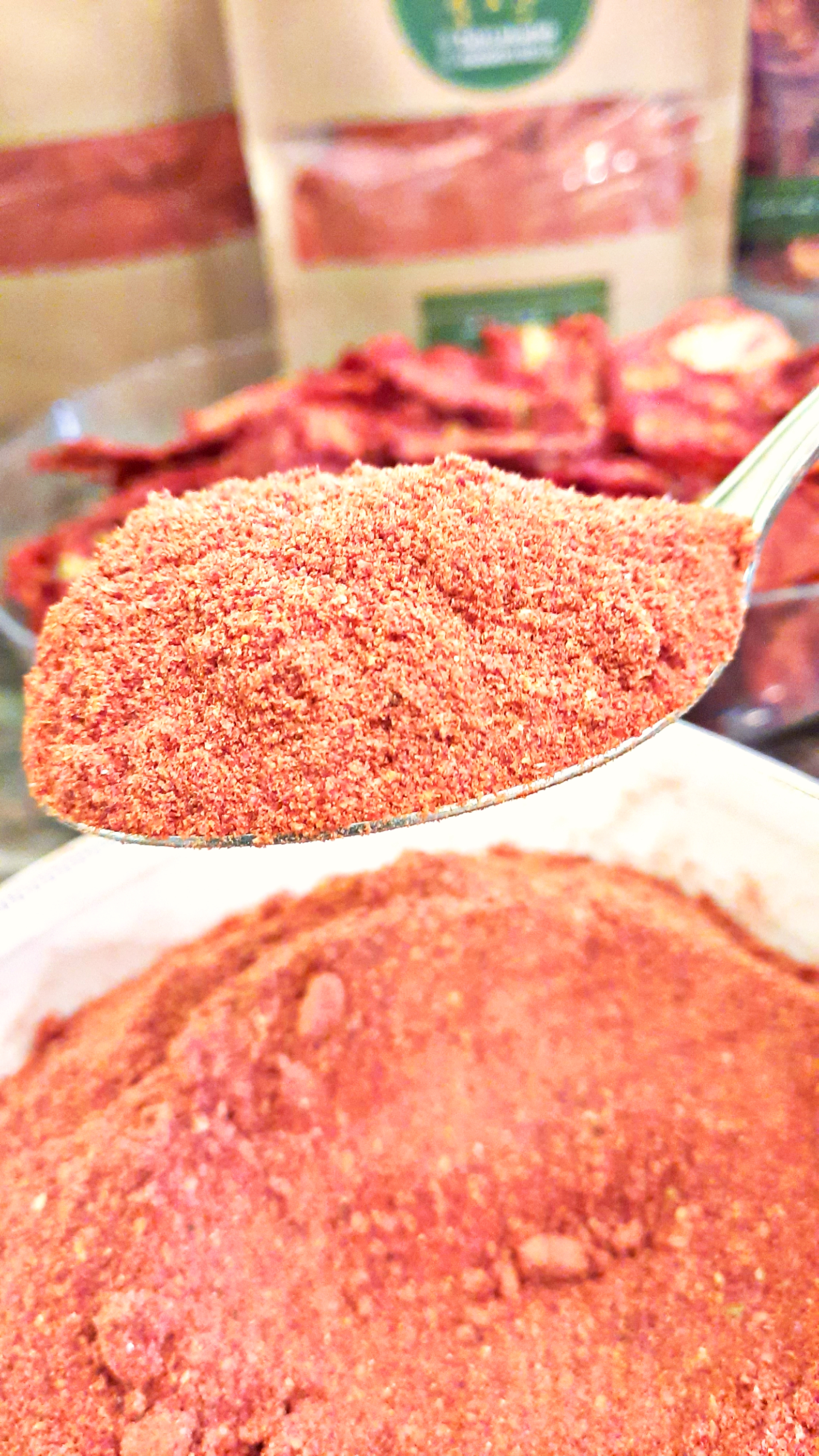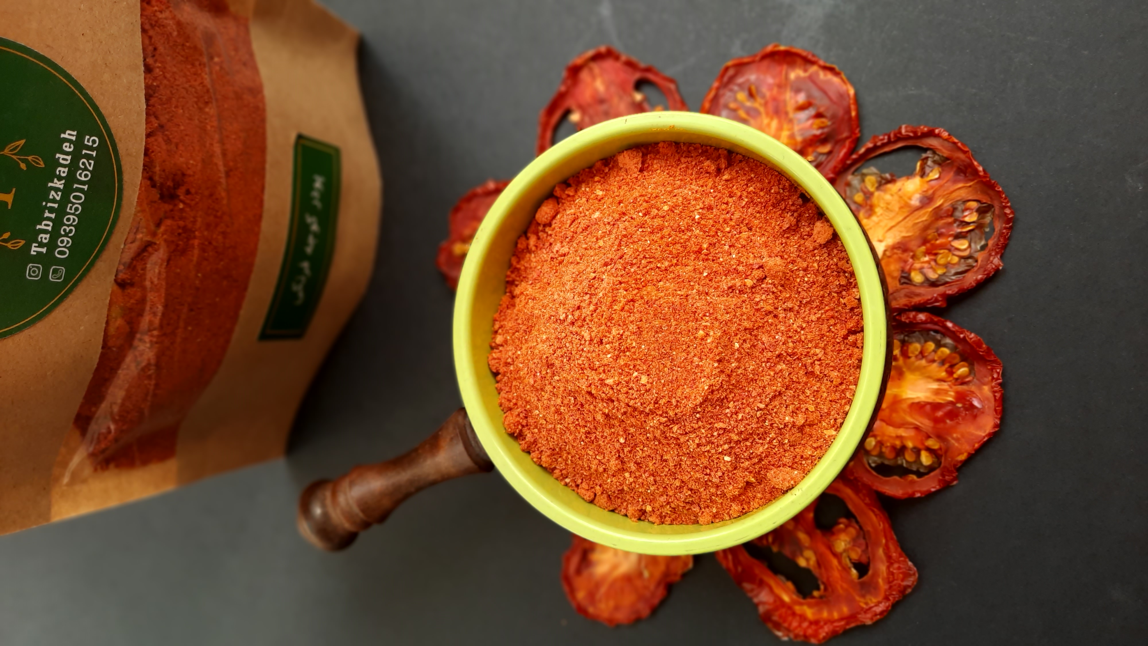 پودر گوجه فرنگی تبریزکده از گوجه های تازه و ارگانیک بومی شهر تبریز تهیه شده یه چاشنی طعم و رنگ فوق العاده برای انواع خورشتها، سوپهای با پایه گوجه فرنگی، پیتزا، ماکارونی و حتی انواع آش های سنتی و حتی آبگوشت و کوفته س